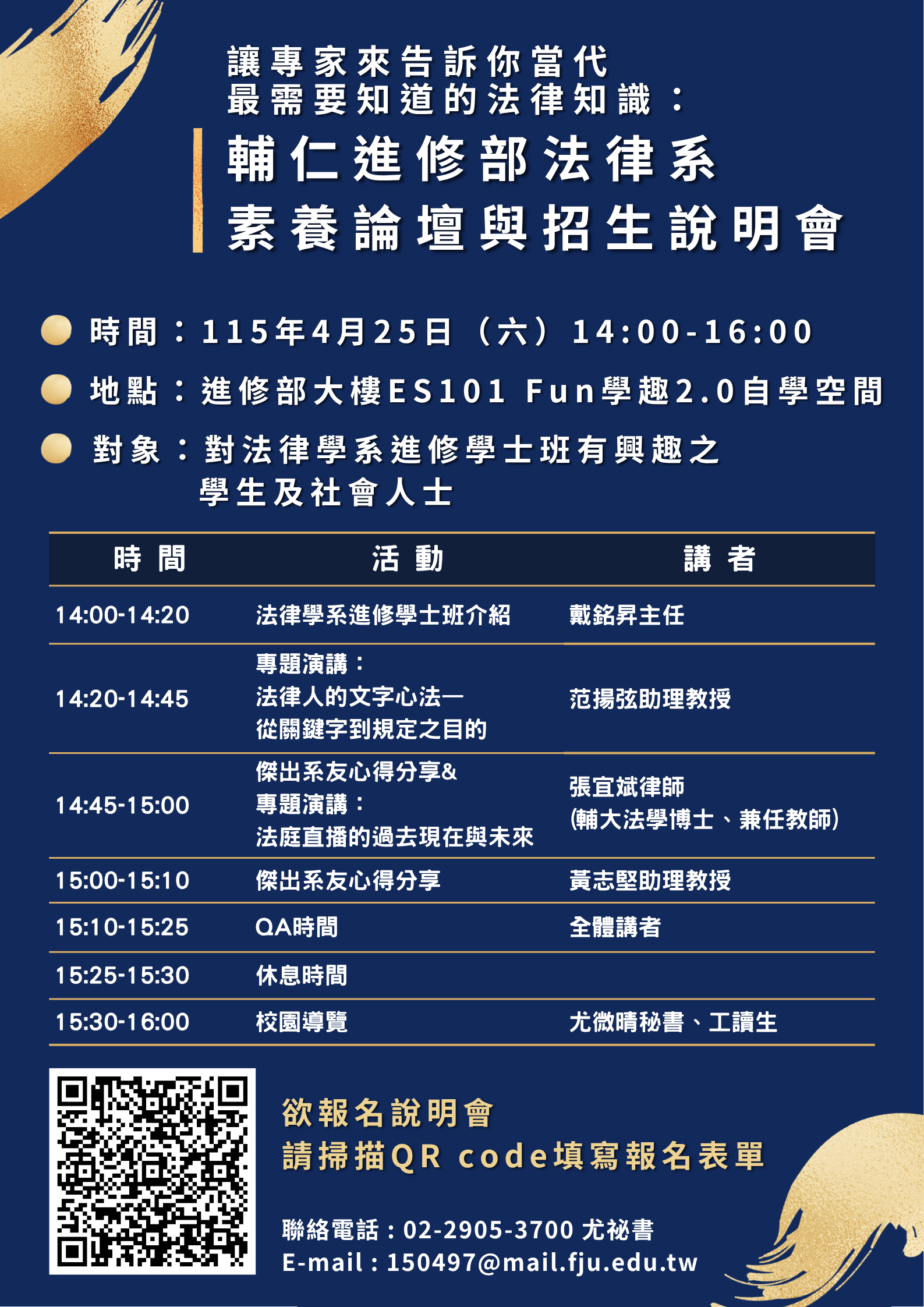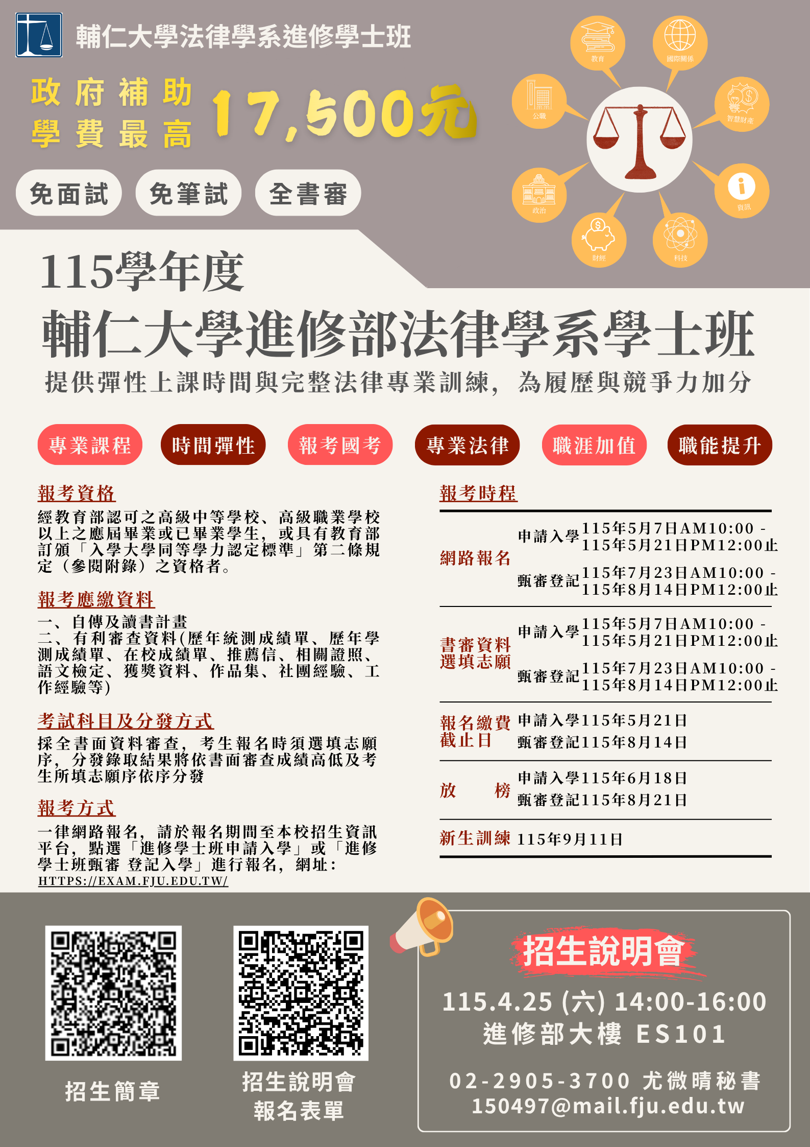 🔹 對象:對法律學系進修學士班有興趣之學生及社會人士