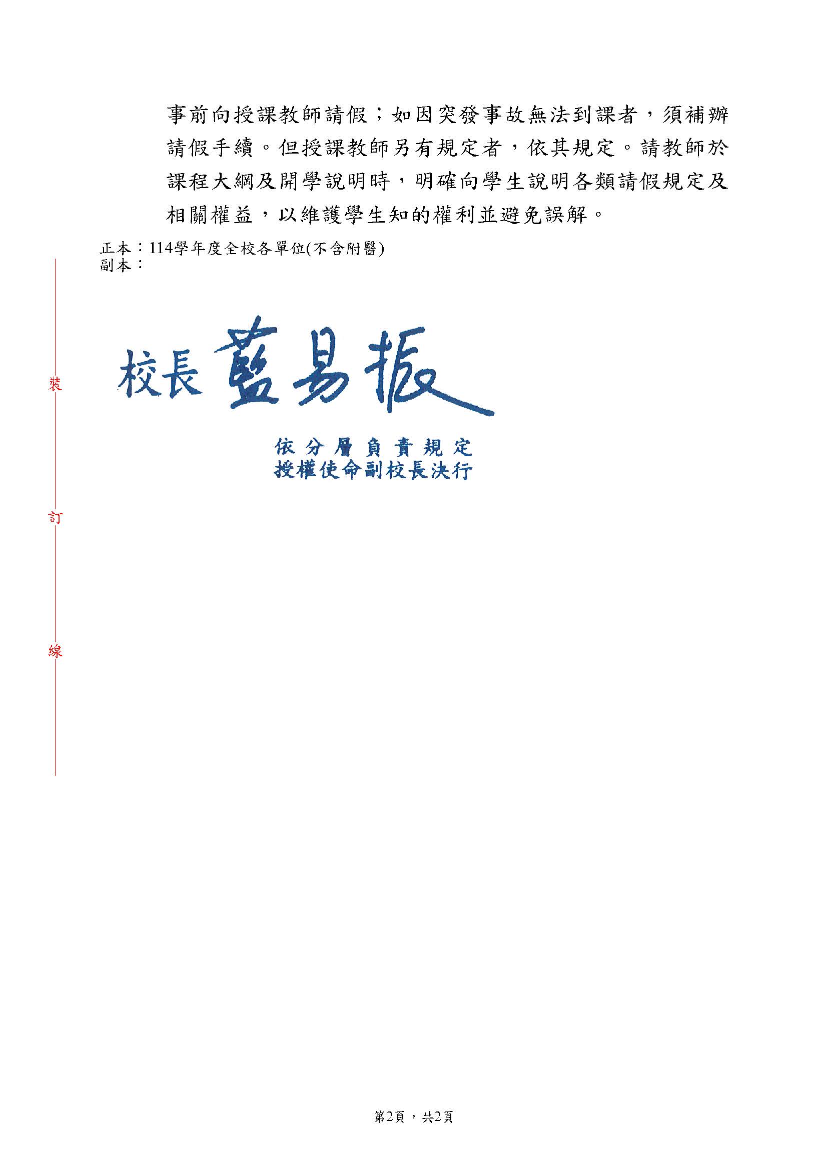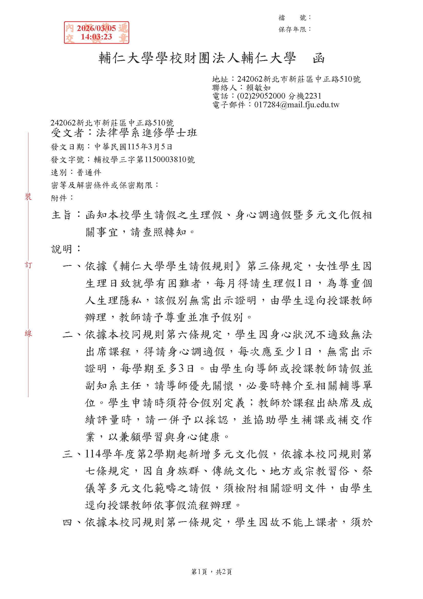 【校內公告】本校學生請假之生理假、身心調適假暨多元文化假相關事宜