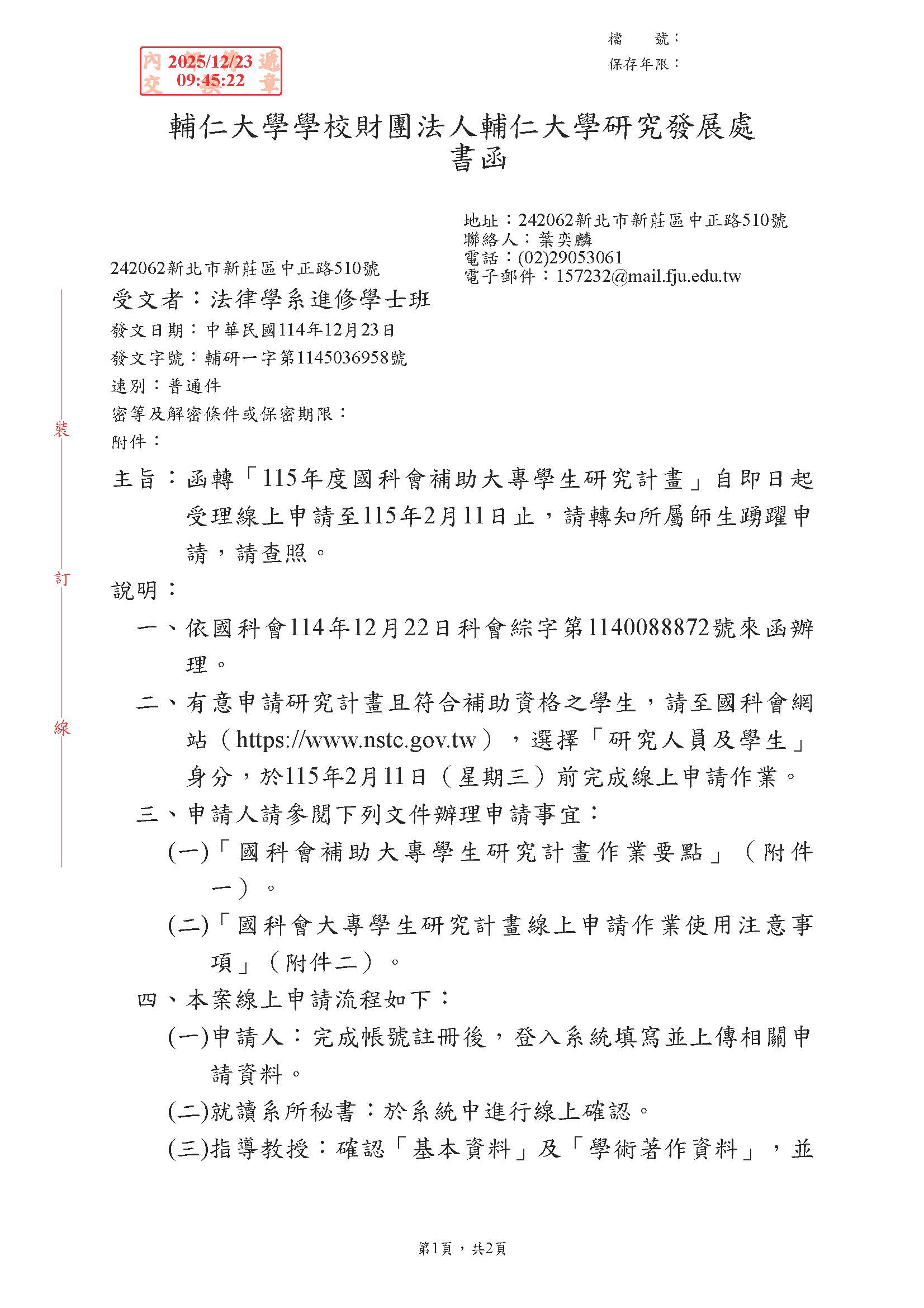 【校內公告】115年度國科會大專學生專題研究計畫,即日起至115年2月11日線上截止申請