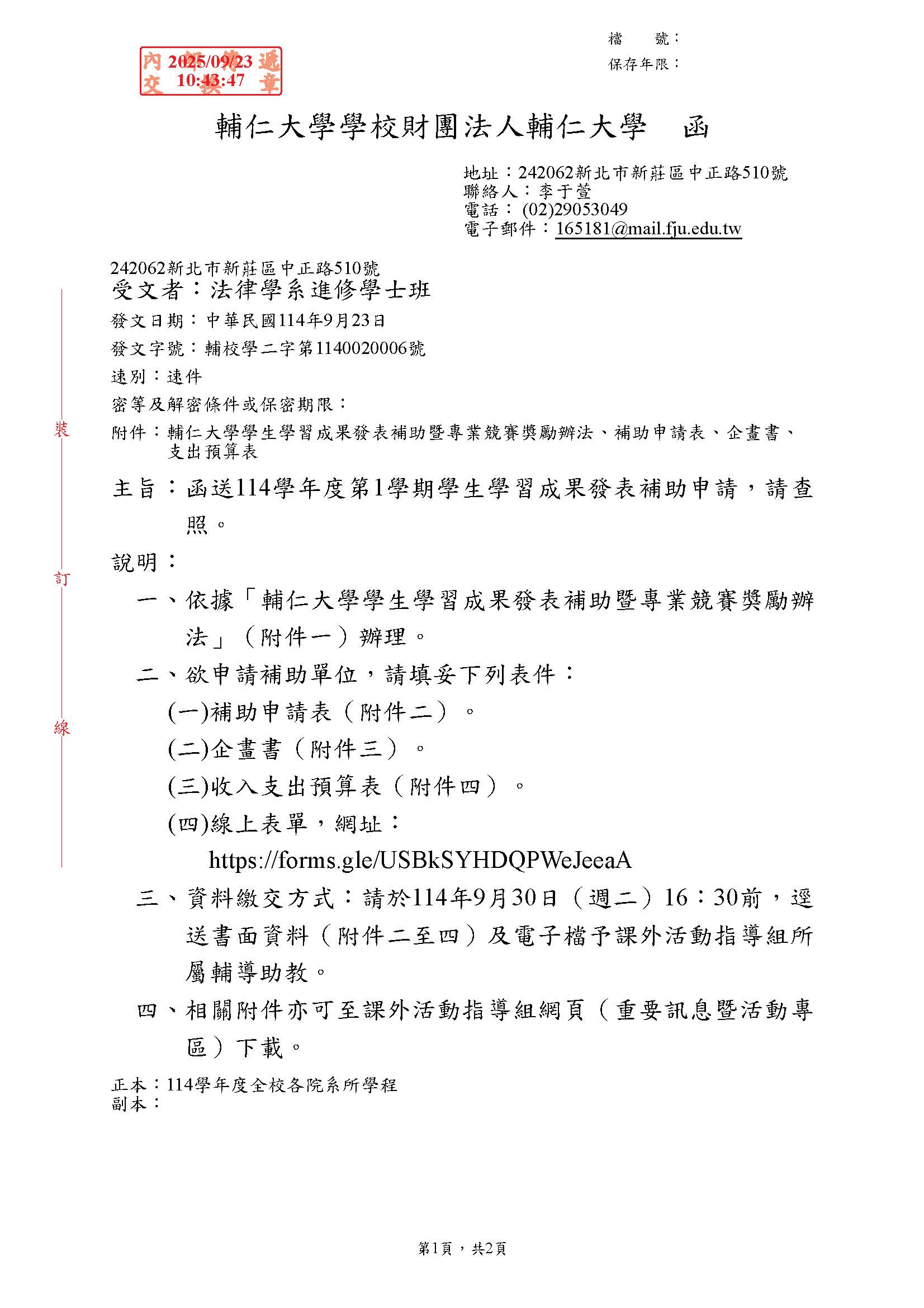 【校內公告】114學年度第1學期學生學習成果發表補助申請