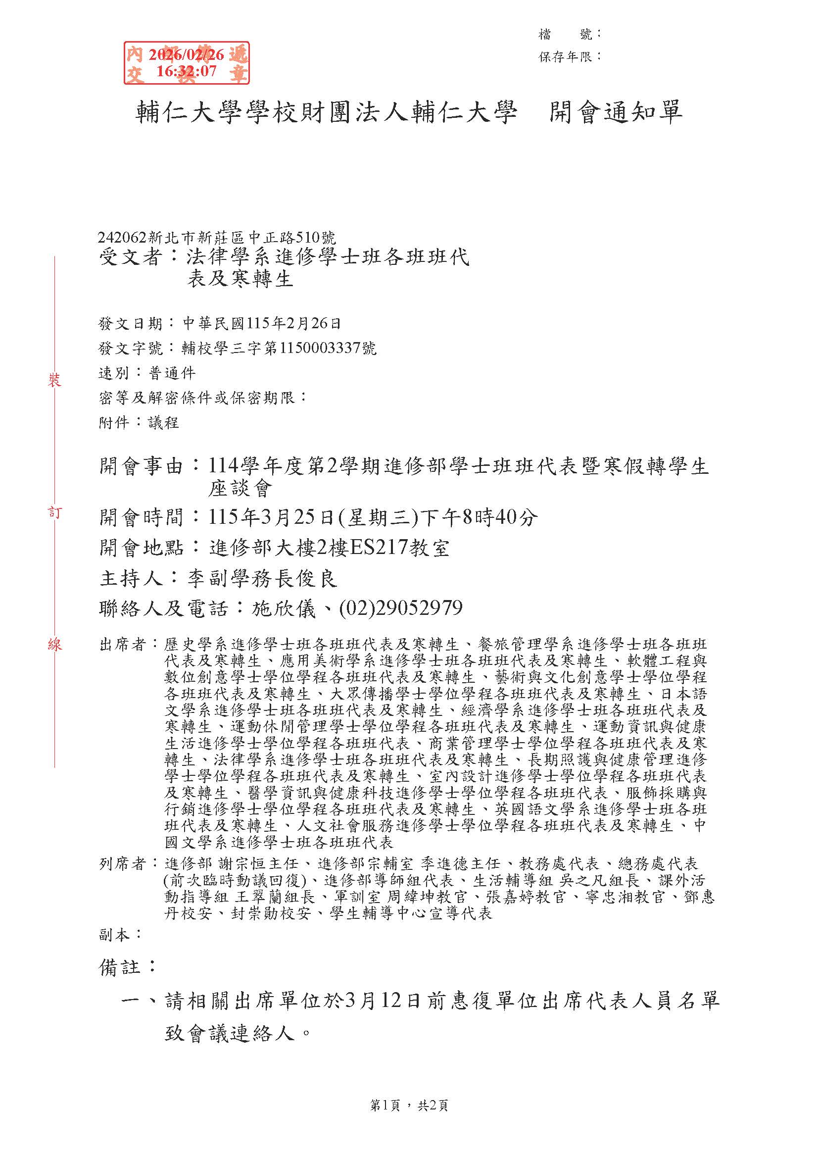 【校內公告】114學年度第2學期進修部學士班班代表暨寒假轉學生座談會