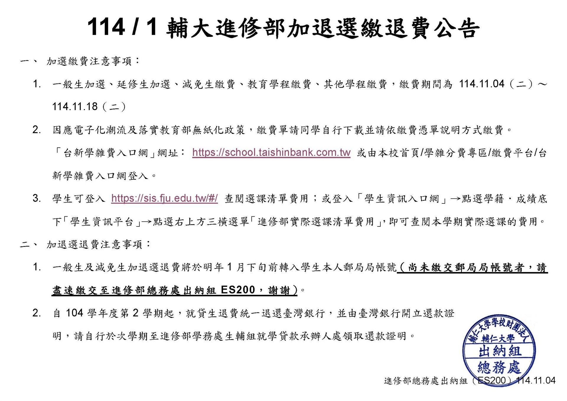 有費用上的問題,請同學洽進修部總務處出納組詢問。