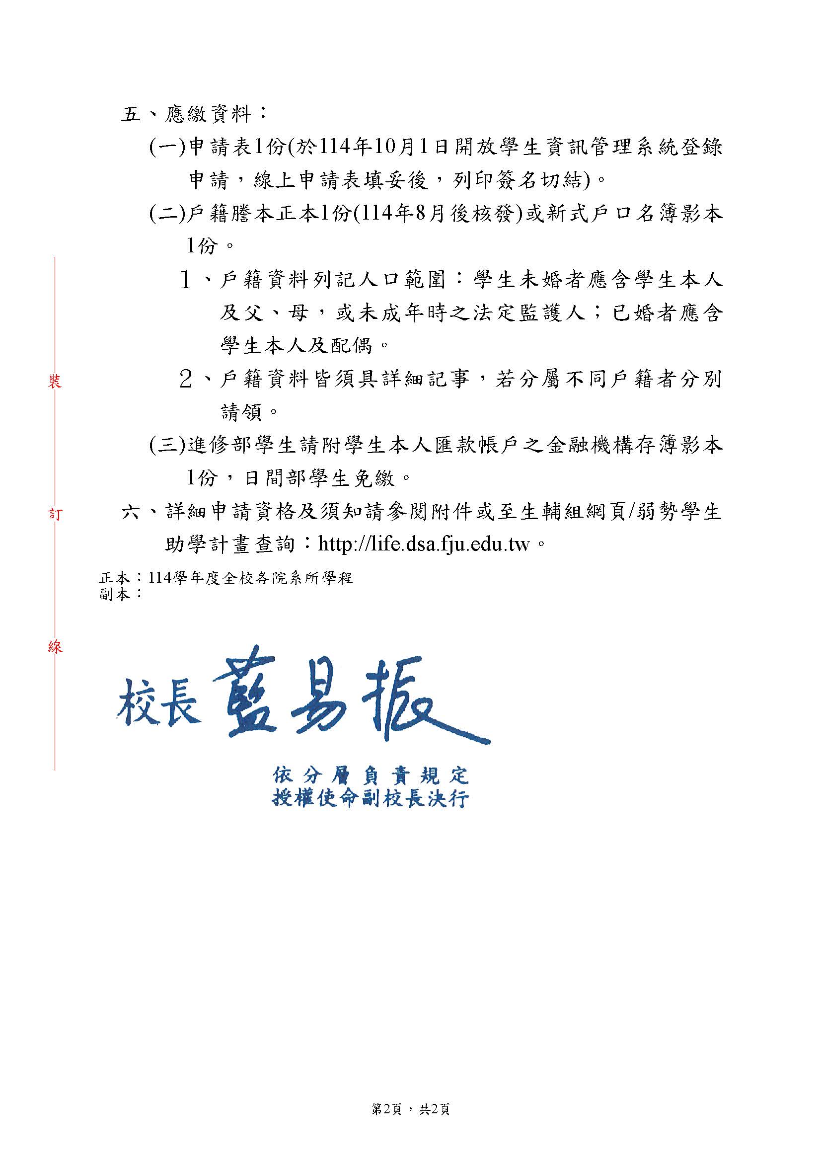 114輔大-弱勢學生助學計畫助學金申辦須知