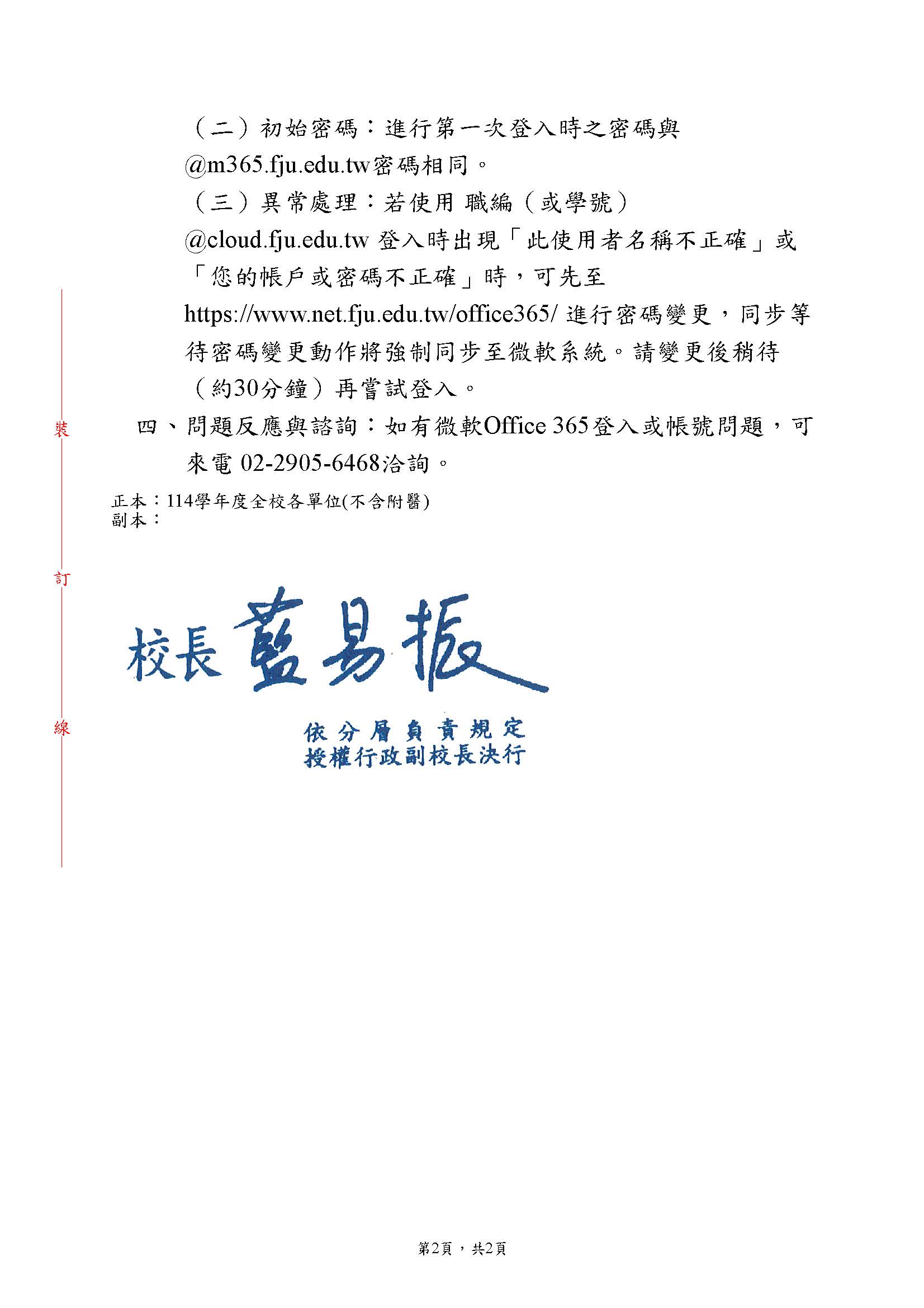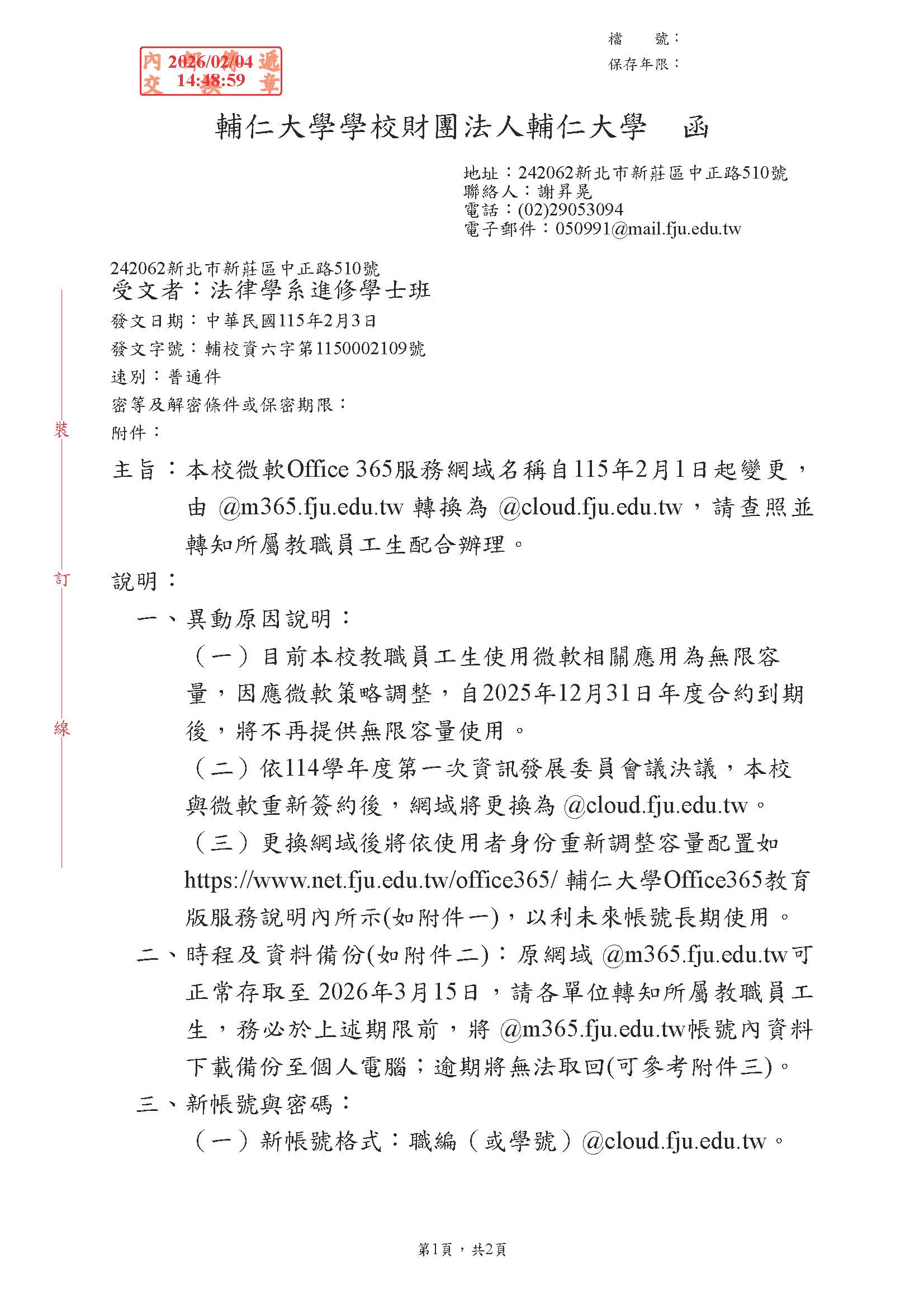【校內公告】微軟Office 365服務網域名稱自115年2月1日起變更,由 @m365.fju.edu.tw 轉換為 @cloud.fju.edu.tw