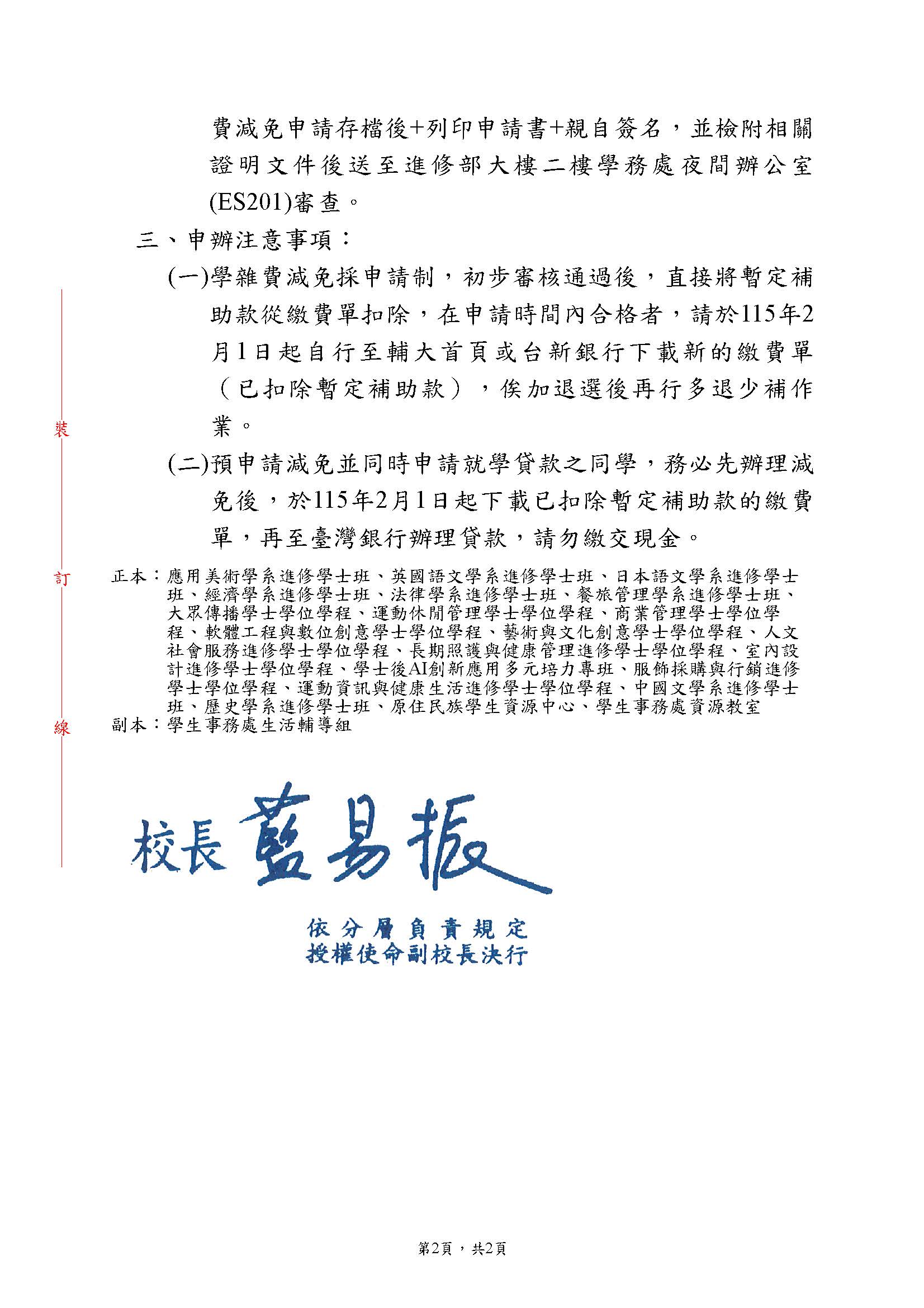 114-2進修部同學申辦就學優待減免注意事項