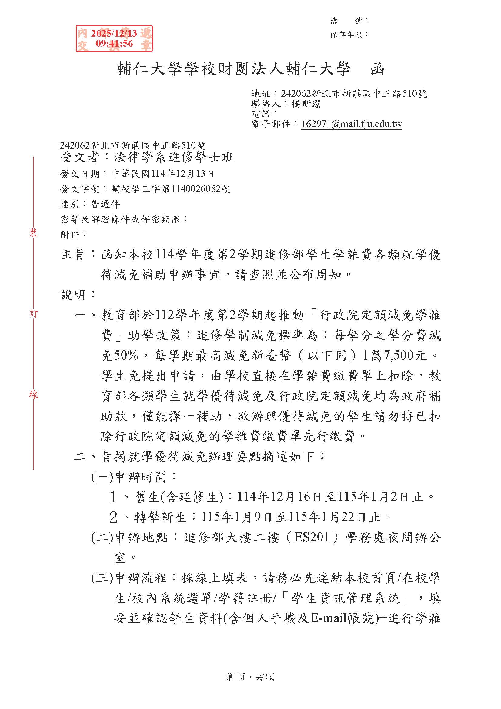 【校內公告】輔仁大學114學年度第二學期辦理教育部各類就學優待減免注意事項