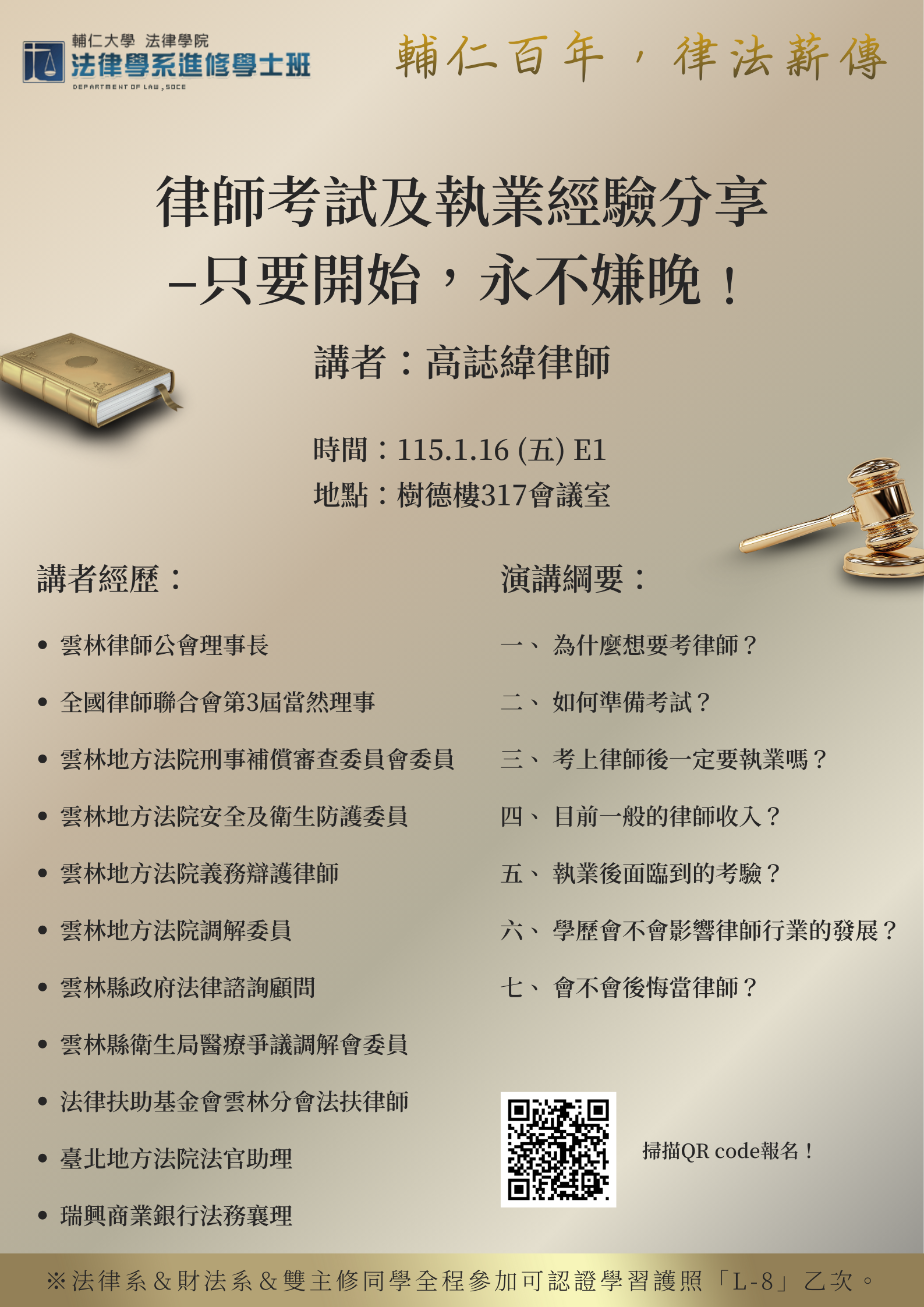 講座名稱|律師考試及執業經驗分享–只要開始,永不嫌晚﹗