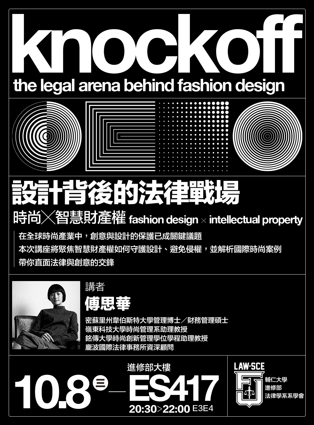 由傅老師主講的「設計背後的法律戰場:時尚X智慧財產權」,將從法律和業界的角度剖析時尚設計的智慧財產權問題,幫助師生理解如何在創意與法律之間取得平衡,為未來的設計師與品牌經營者提供思考的方向。