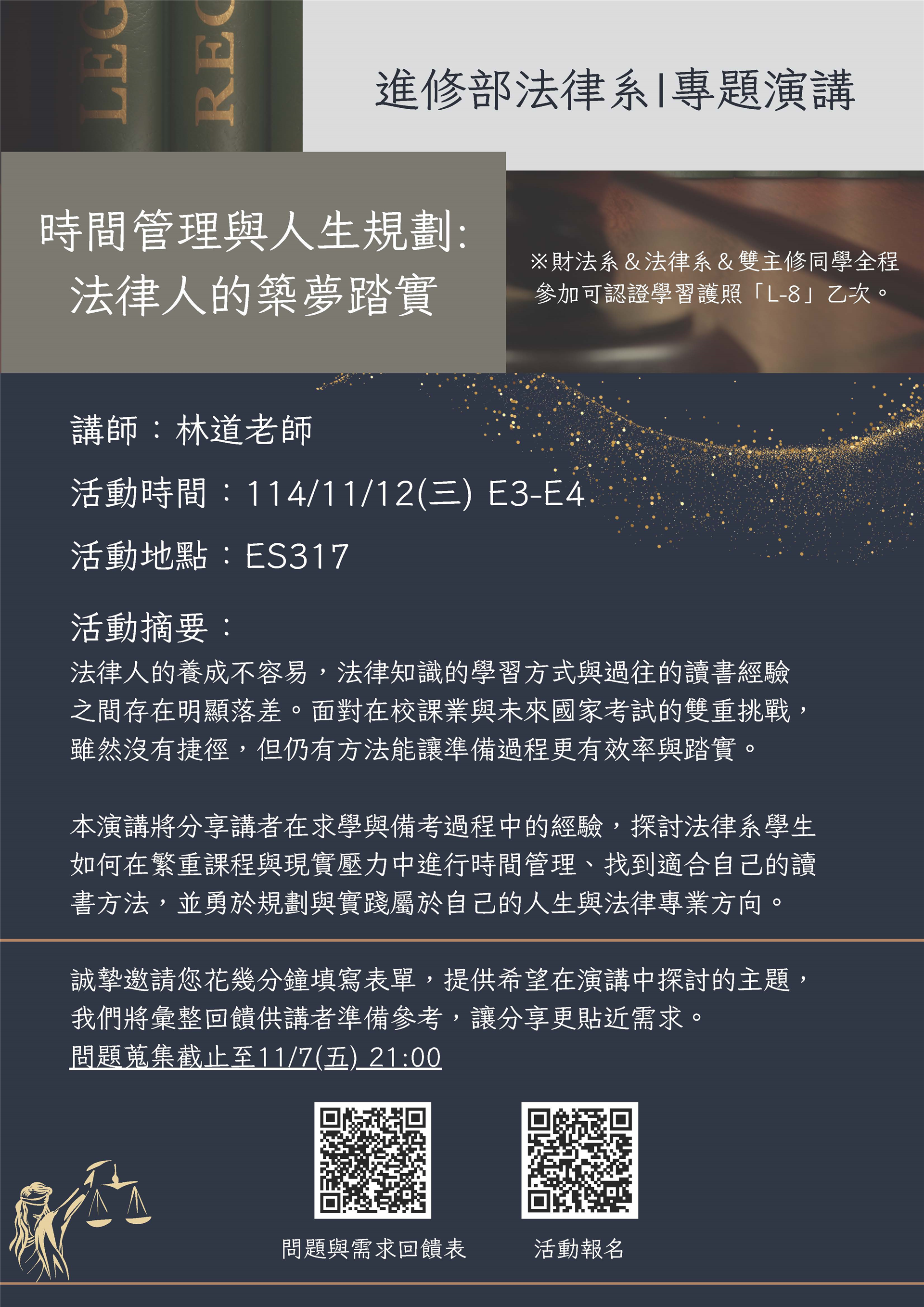 講座名稱:時間管理與人生規劃:法律人的築夢踏實